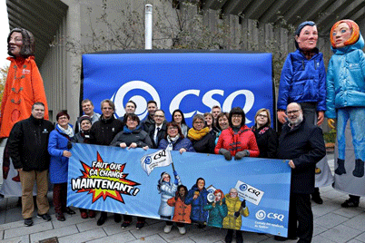 Québec, le 24 octobre 2019. – Profitant de la tenue à Québec de leur conseil général, près de 200 déléguées et délégués de la Centrale des syndicats du Québec (CSQ) se sont rendus jusqu’au Secrétariat du Conseil du trésor où ils se sont mobilisés pendant que leurs représentantes et représentants déposaient leurs demandes en vue de la prochaine négociation dans le secteur public.