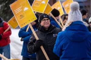 Lors des jours ouvrables, le personnel enseignant en grève, représenté par l’Association des employés du Nord québécois (AENQ-CSQ), fera du piquetage devant les écoles des 14 communautés Inuit du Québec. En solidarité avec les collègues du Nord, plusieurs membres de la CSQ se sont rassemblés, le 16 janvier 2025, devant les bureaux de la Commission scolaire Kativik, à Montréal.