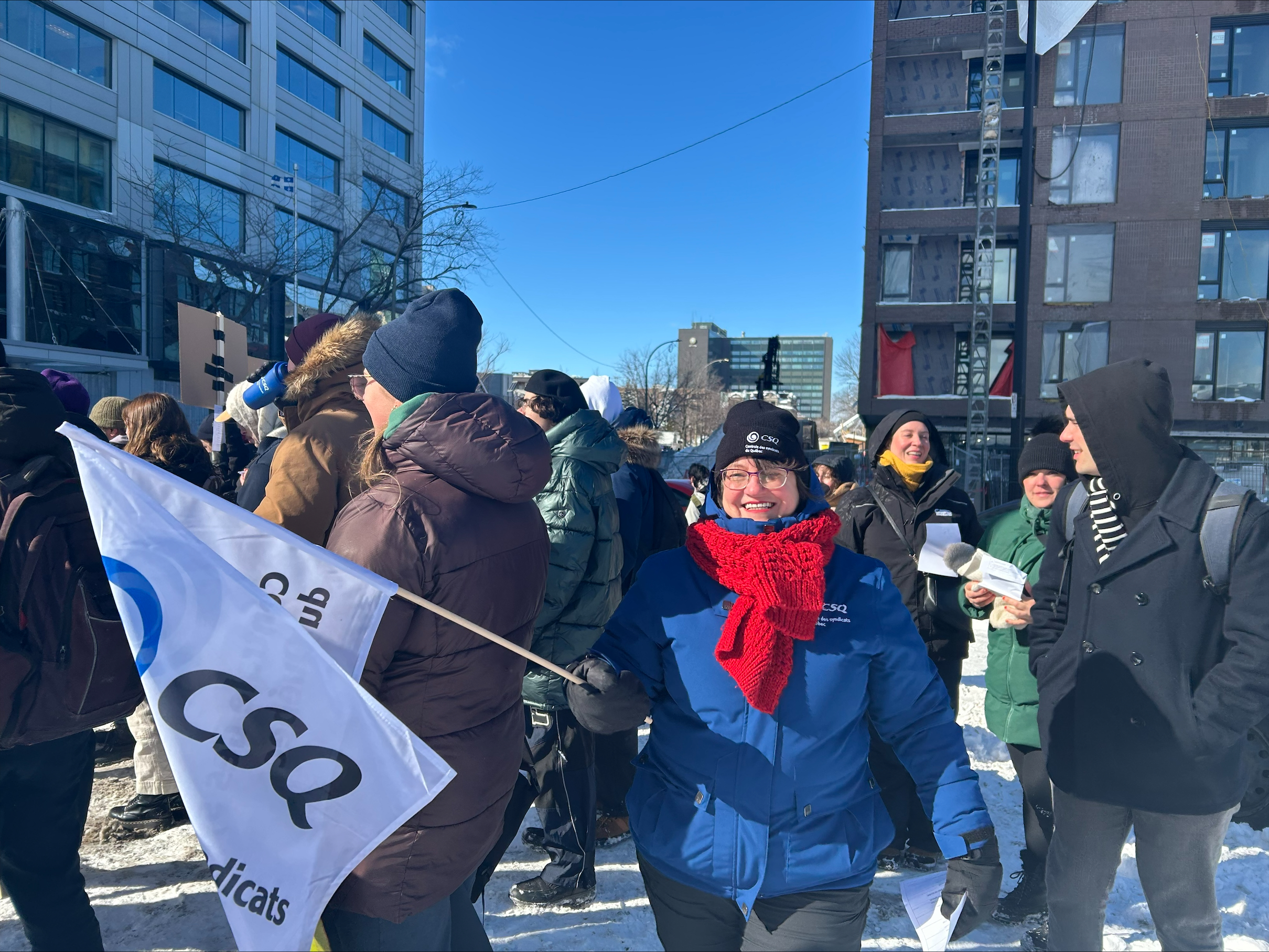 Une centaine de personnes se sont rassemblées le 14 février devant les bureaux de la ministre de l’Enseignement supérieur, Pascale Déry, à Montréal, afin de dénoncer le récent retrait des bourses Perspective Québec. La CSQ était présente à la manifestation en appui aux étudiantes et étudiants, aux côtés de la Fédération étudiante collégiale du Québec (FECQ), de l’Union étudiante du Québec (UEQ) et de plusieurs fédérations et associations étudiantes.