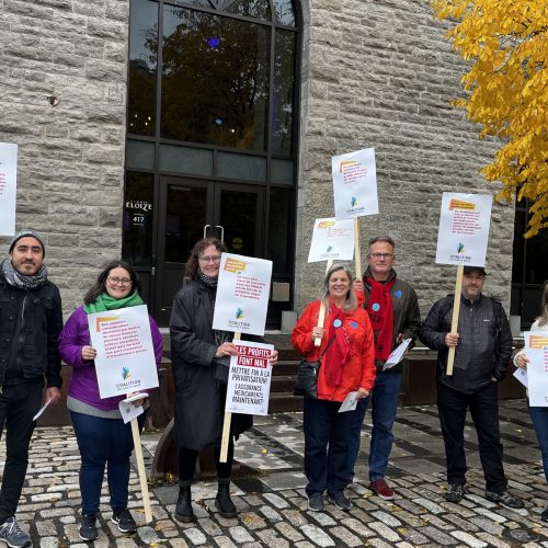 Une vingtaine de militantes et de militants se sont rassemblés, le 23 octobre dernier, devant les bureaux du Cirque Éloize, à Montréal, afin de dénoncer le recours au privé en santé et d’exprimer leur appui au réseau public.
