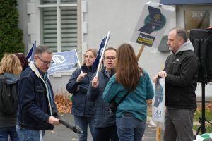 Le personnel enseignant en francisation à la formation générale des adultes membre du Syndicat de l’enseignement des Bois-Francs s’est aussi mobilisé devant le bureau du député d’Arthabaska, Éric Lefebvre. Les enseignantes et enseignants ont remis une lettre dénonçant les récentes coupes à son attaché politique, Pierre-Luc Turgeon. Ils ont exprimé leurs inquiétudes face à l’absence de service de francisation que subiraient leurs élèves, puisqu’aucun autre organisme de la région n’est en mesure de prendre la relève.