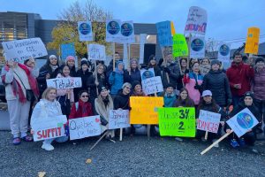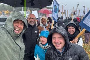 Près d’une centaine de militantes et militants, membres du Syndicat de Champlain, de l’Association des professeurs de Lignery, du syndicat de l’enseignement de la région de Vaudreuil, du Syndicat de l’enseignement du Haut-Richelieu et des élèves en francisation, ont manifesté le 11 novembre devant les bureaux de Jean-François Roberge, député de Chambly pour la Coalition avenir Québec (CAQ), ministre de l’Immigration, de la Francisation et de l’Intégration et ancien ministre de l’Éducation, afin de dénoncer les compressions en francisation.